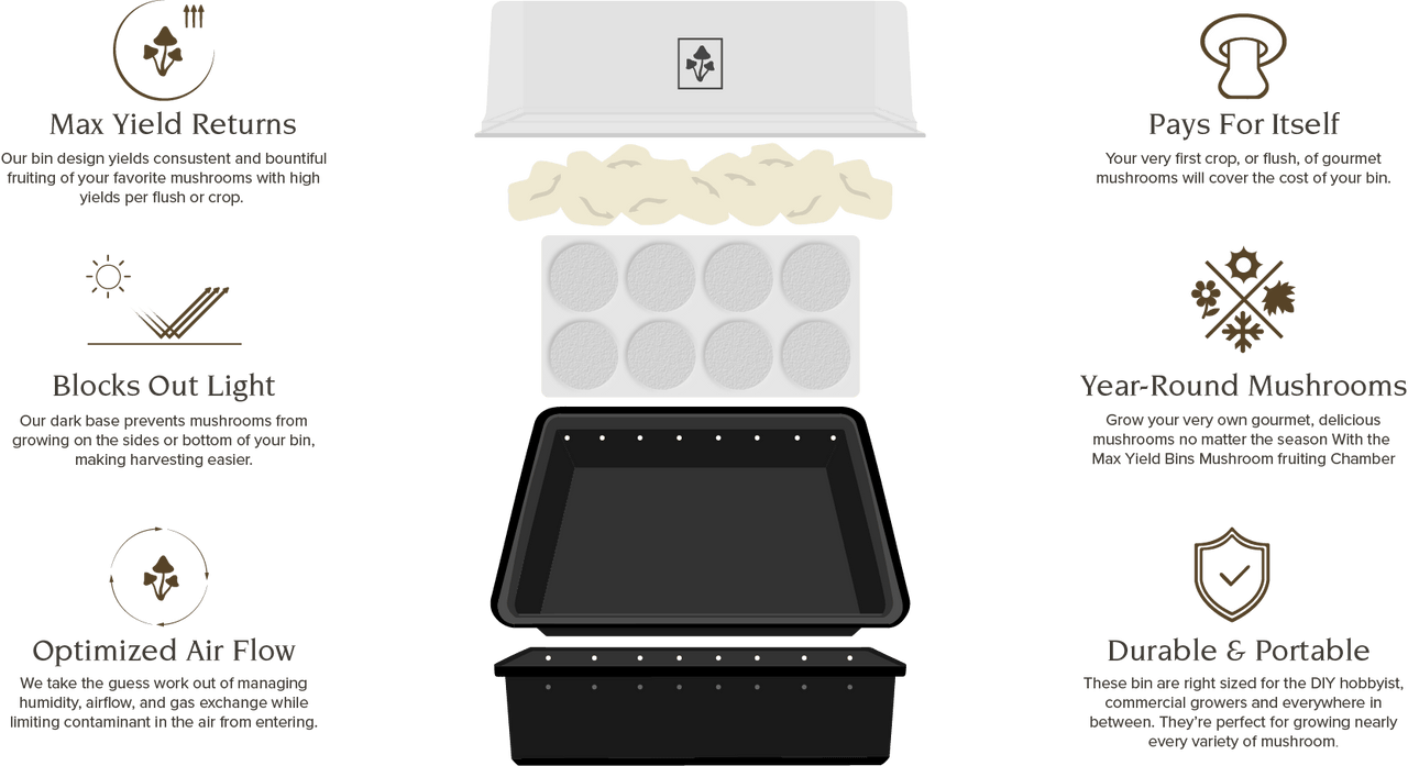 We take the guess work out of managing humidity, airflow, and gas exchange while limiting contaminant in the air from entering. Our dark base prevents mushrooms from growing on the sides of the bin, making harvesting easier. Our bin design yields consistent and bountiful fruiting of your favorite mushrooms with high yields per flush or crop every time!